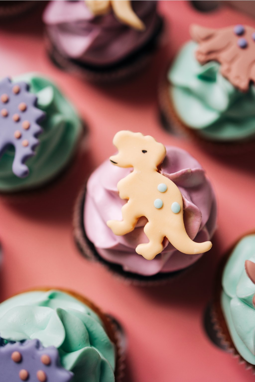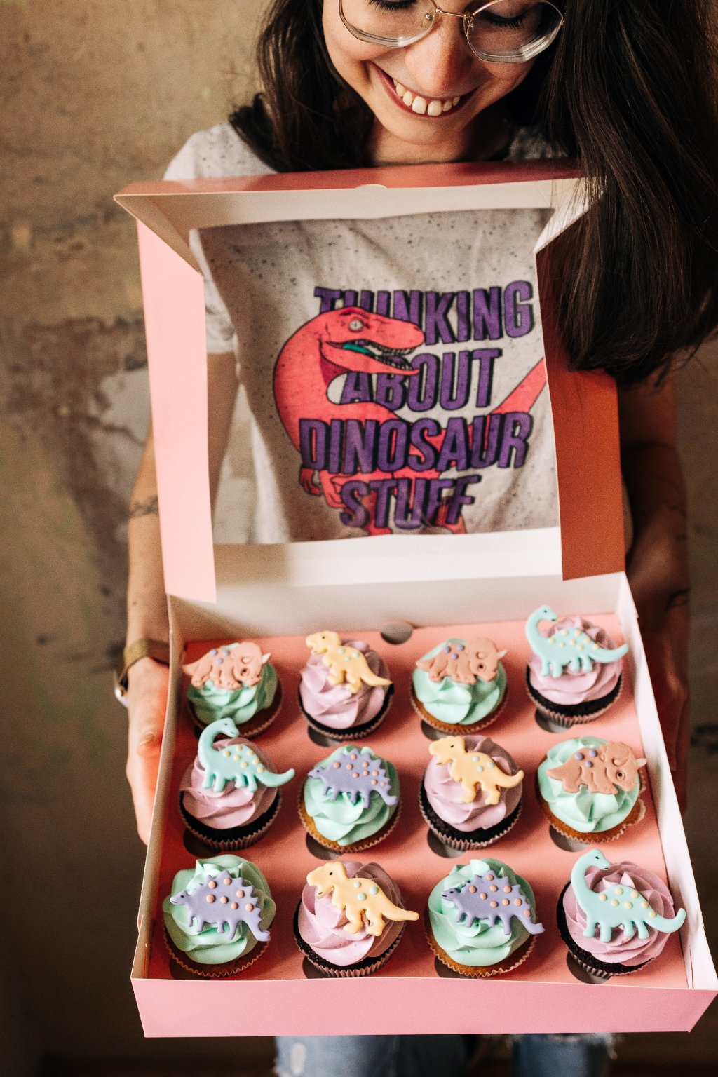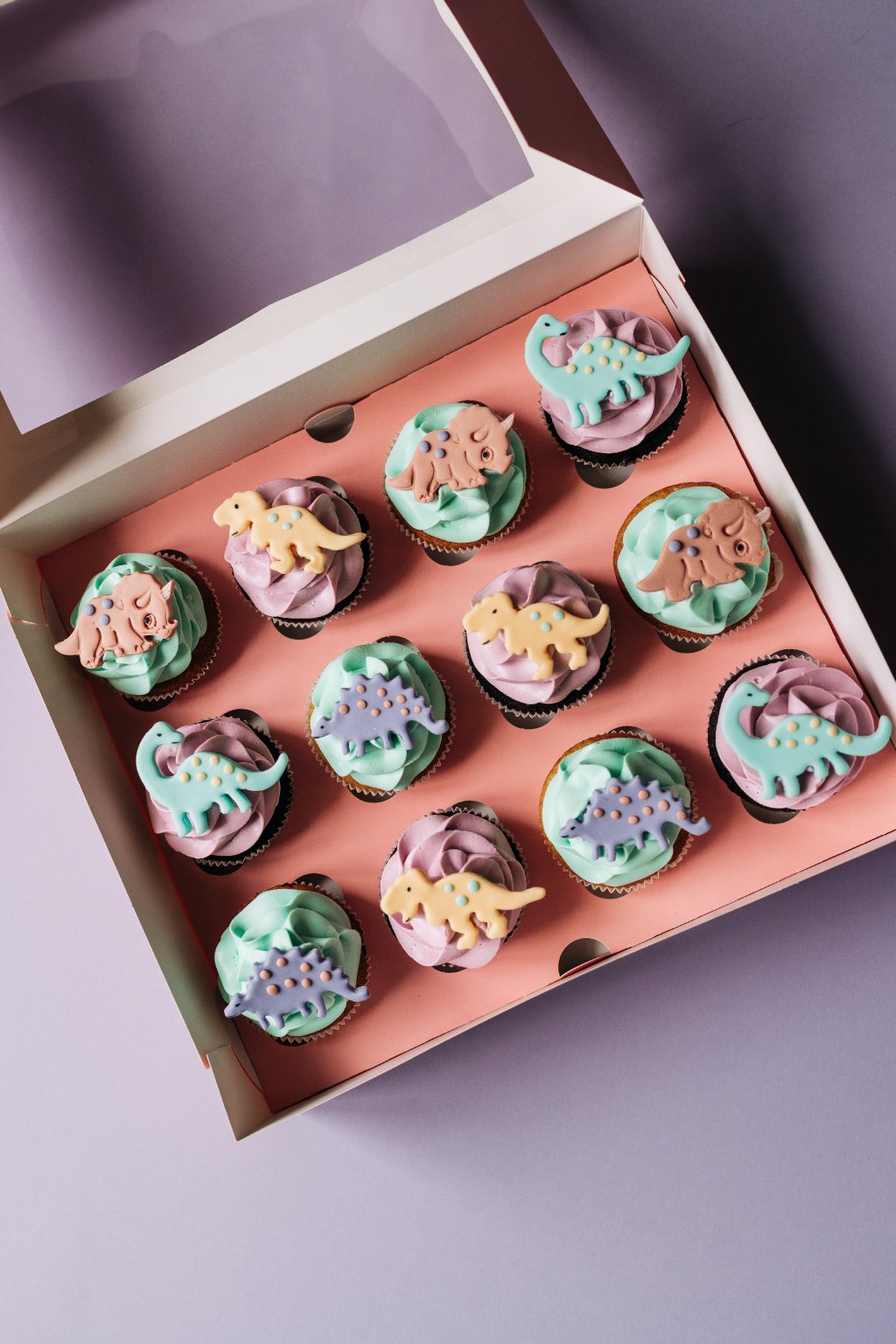 12ks cupcakes s cukrovým zdobením ve tvaru pastelových dinosaurů.