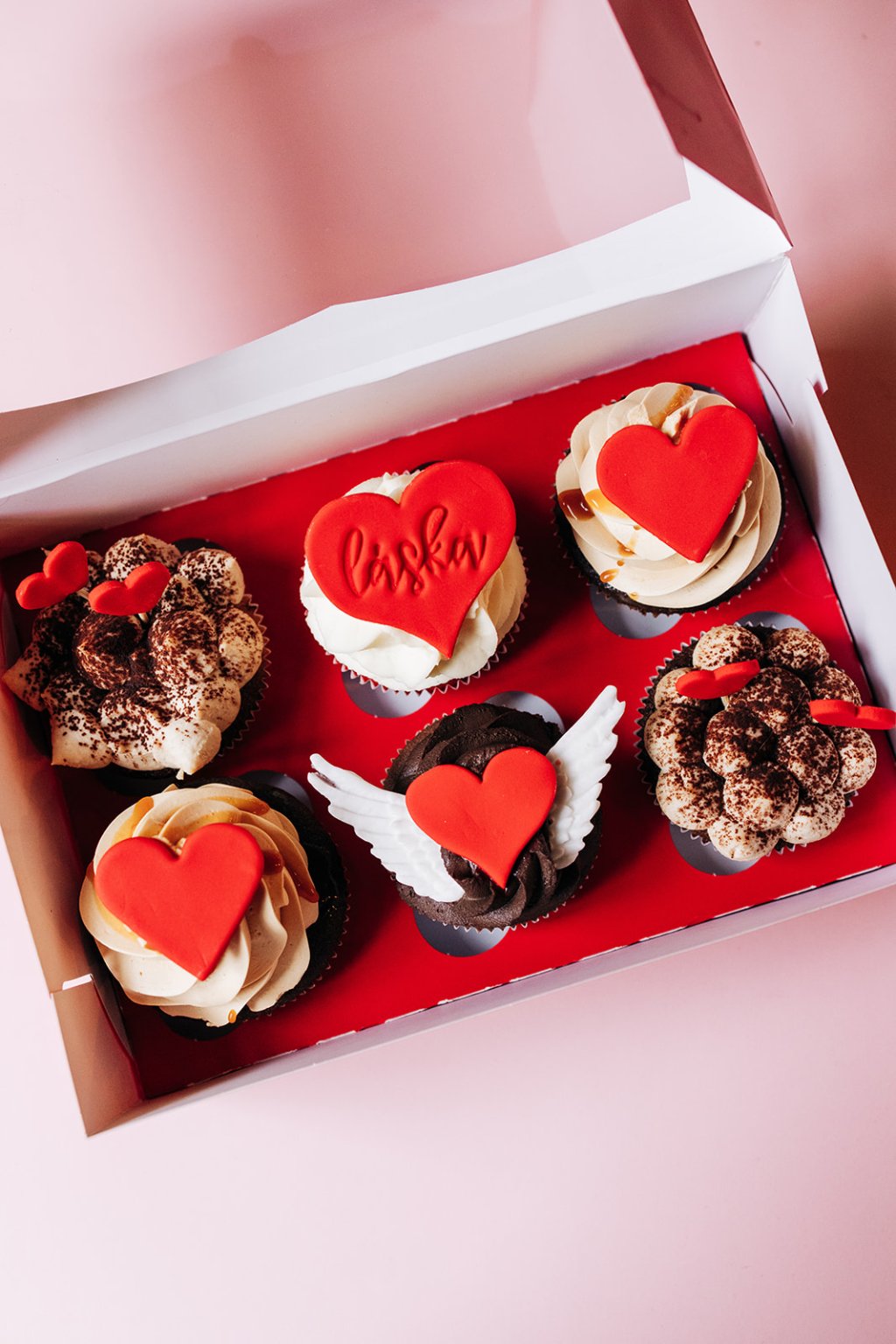 Valentýnská krabička, která obsahuje 6ks cupcakes v červené variantě.