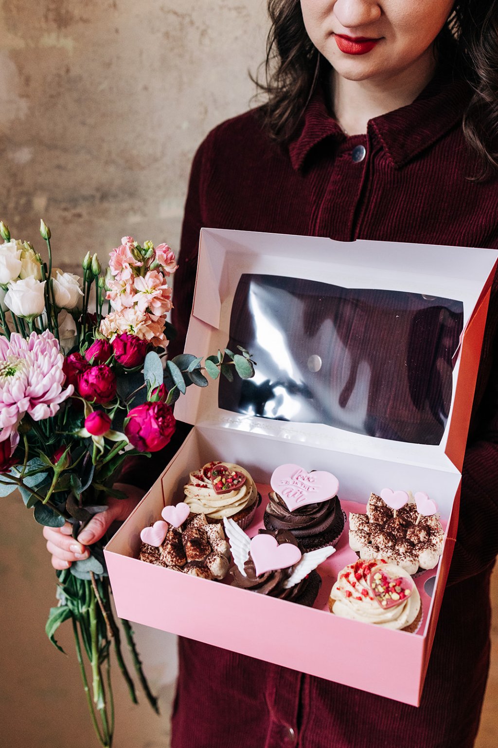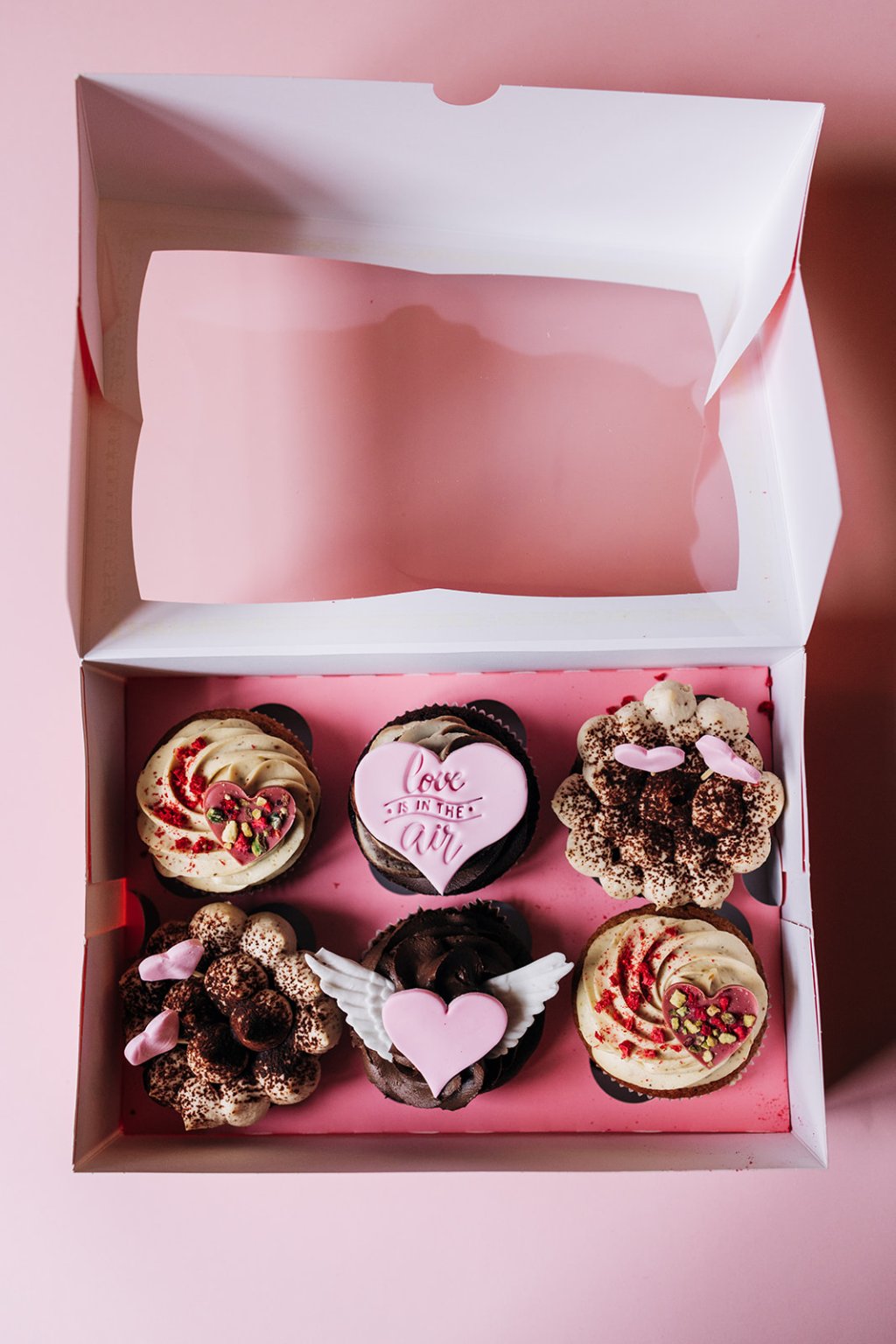 Valentýnská krabička, která obsahuje 6ks cupcakes v růžovém provedení .