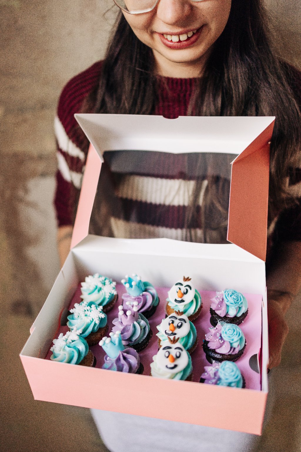 12 mini cupcakes s tématickým zdobením z pohádek Frozen.