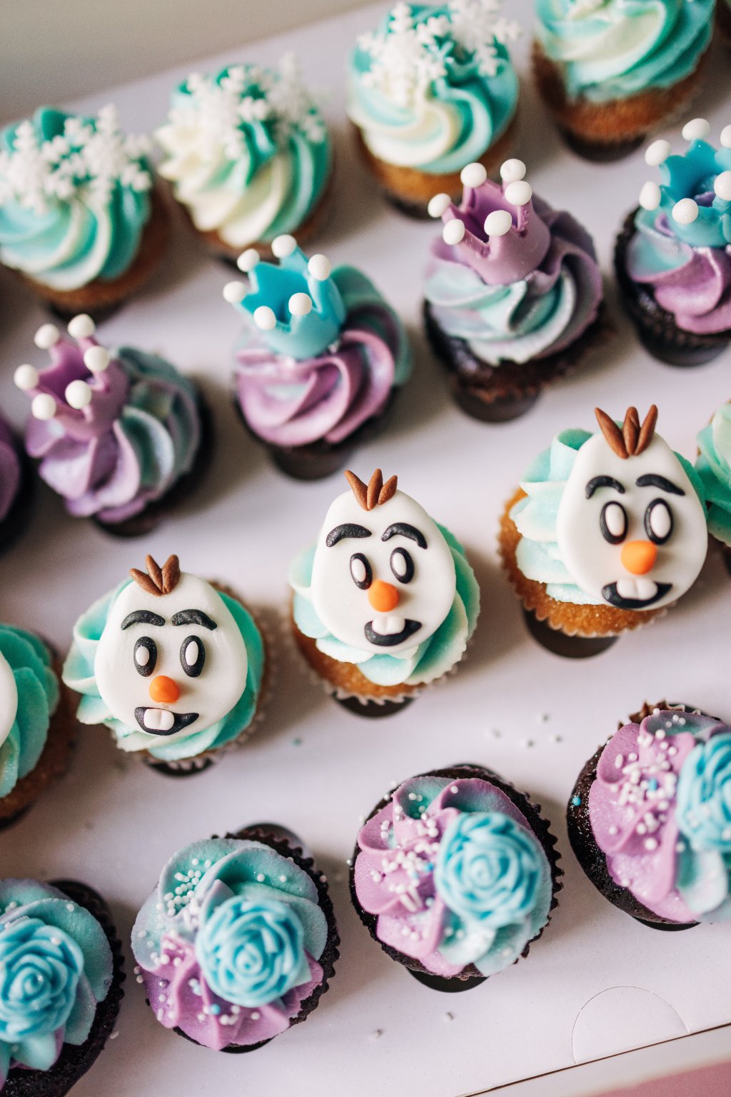 24 mini cupcakes s tématickým zdobením z pohádek Frozen.