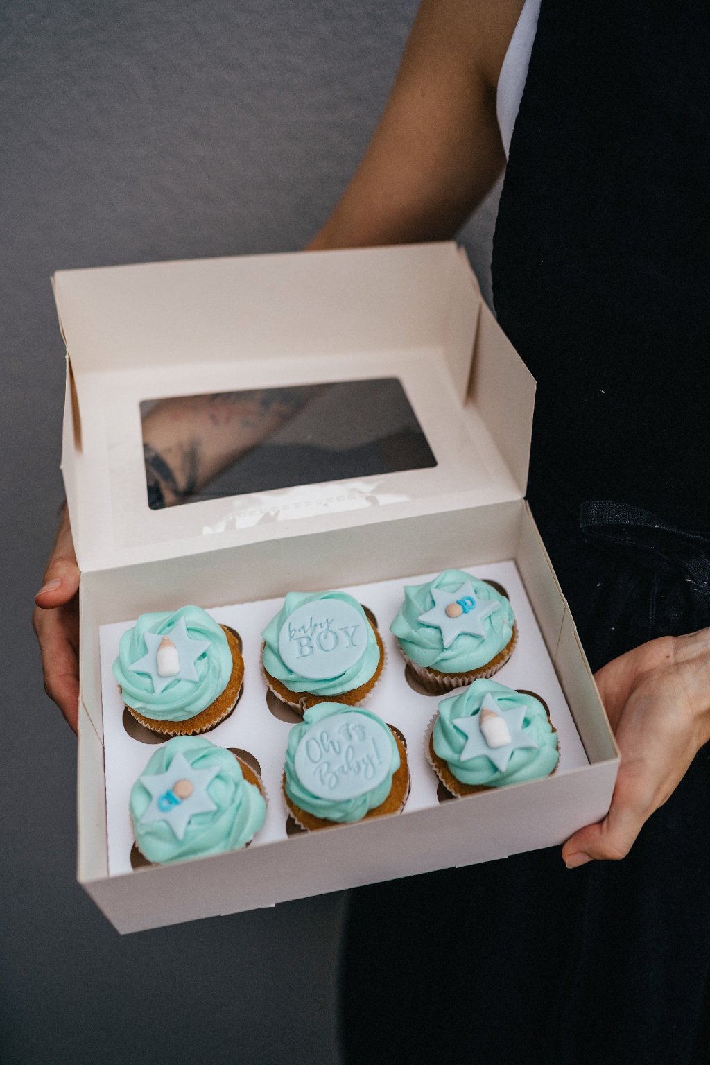 6ks cupcakes v modré barvě je skvělý způsob jak všem dát na vědomí, že očekáváte malého uličníka.