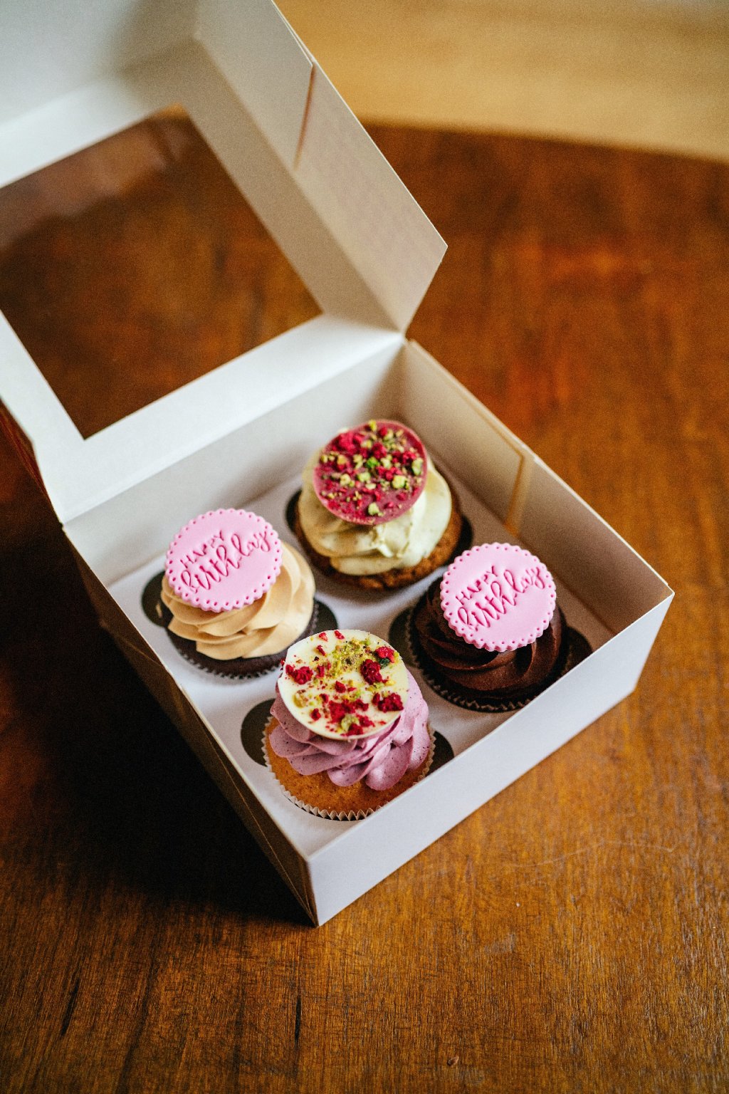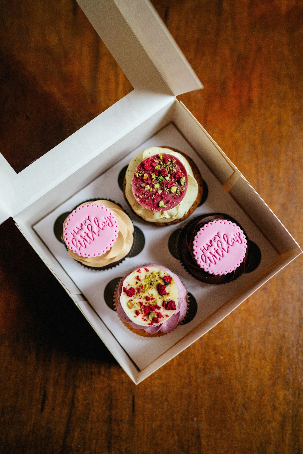 Růžové narozeninové 4 ks cupcakes (v krabičce)