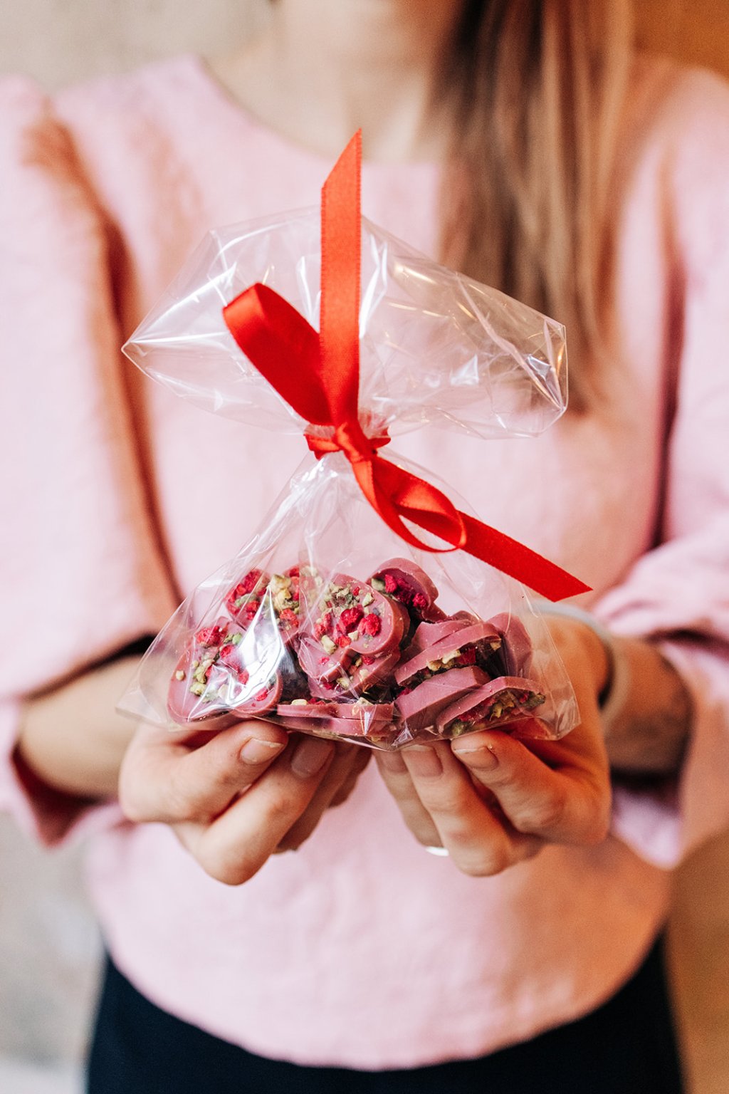 Čokoládová srdíčka z kvalitní RUBY Callebaut peckové čokolády posypané lyofilizovanými malinami a sekanými pistáciemi.