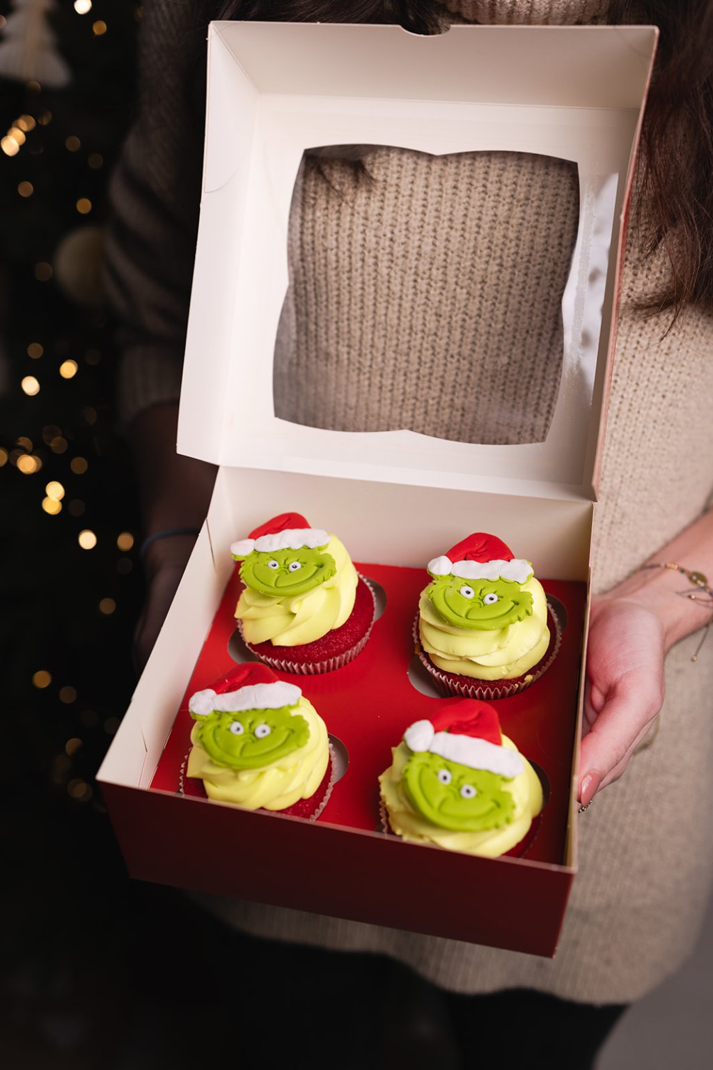 4x red velvet cupcakes se zeleným cream cheese-mascarpone krémem s fondánovou dekorací.